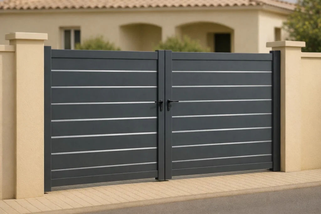 Portails à deux vantaux sur mesure, manuels ou motorisés. Aluminium, acier, fer forgé. Finitions personnalisées, pose soignée.